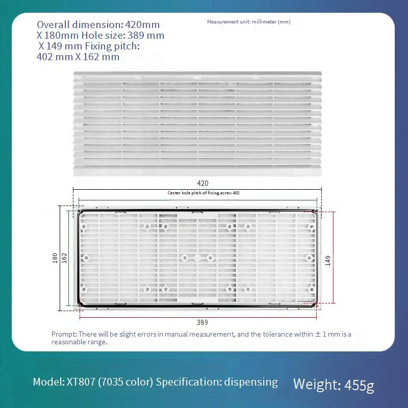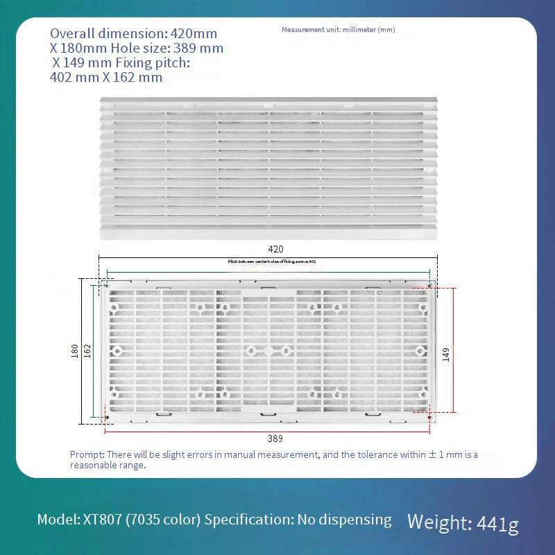 आसान दैनिक रखरखाव और प्रतिस्थापन के लिए एक प्रतिस्थापन योग्य फिल्टर जाल डिजाइन की सुविधा है, जो दीर्घकालिक परिचालन लागत को काफी कम करता है। फ़्रेम संरचना मानक सफेद-ग्रे 7035 रंग में उपलब्ध है। इसका निर्माण एबीएस सामग्री से किया गया है जो दीर्घकालिक स्थिरता सुनिश्चित करते हुए उत्कृष्ट विरूपण प्रतिरोध प्रदान करता है।